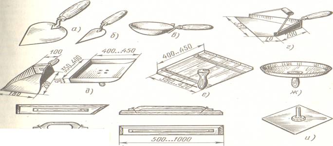а – штукатурная кельма, б – отрезовка, в – ковш, г – совок с качающейся ручкой, д – совок – лопата и сокол – ковш, е- прямоугольный сокол, ж – тарельчатый сокол, з – полутёрки, и – разборный дюраалюминивый сокол.